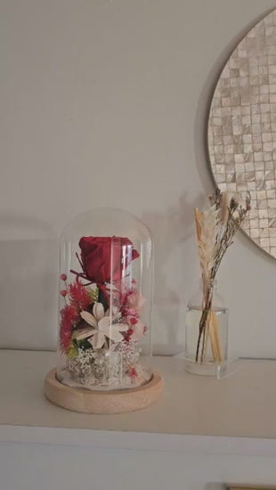 “Soft LED lights create a gentle starlight glow inside the clear dome. It beautifully illuminates your eternal flower bouquet and adds a warm, romantic ambiance while protecting it perfectly.”